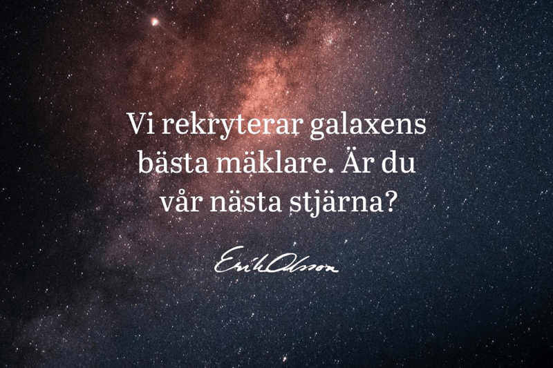 Erik Olsson fastighetsförmedling är välkända för att vara det mäklarföretag som skapar flest mäklarstjärnor i branschen - vi har en skola som är unik och i branschen är vi kända för att ha den bästa mäklarskolan. Vi lämnar inget åt slumpen utan finns där för att hjälpa dig att nå den stjärnglans du förtjänar.